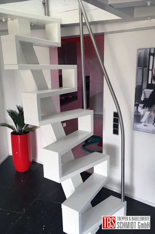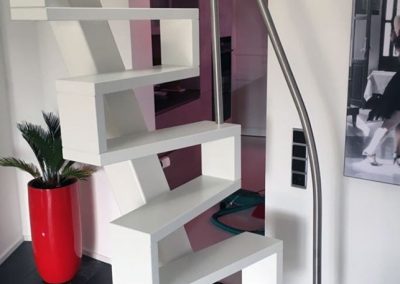Die Treppe aus kleinstem Raum bildet einen wahren Hingucker im engen Wohnraum. Die Raumspartreppe ist aus Buche weiß deckend lackiert gefertigt und das Edelstahlgeländer ist als Bügelkonstruktion an die Treppe montiert.