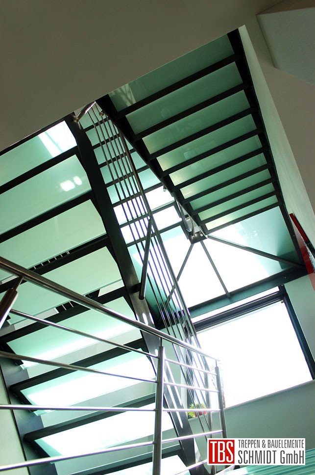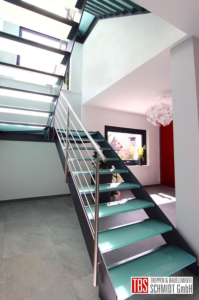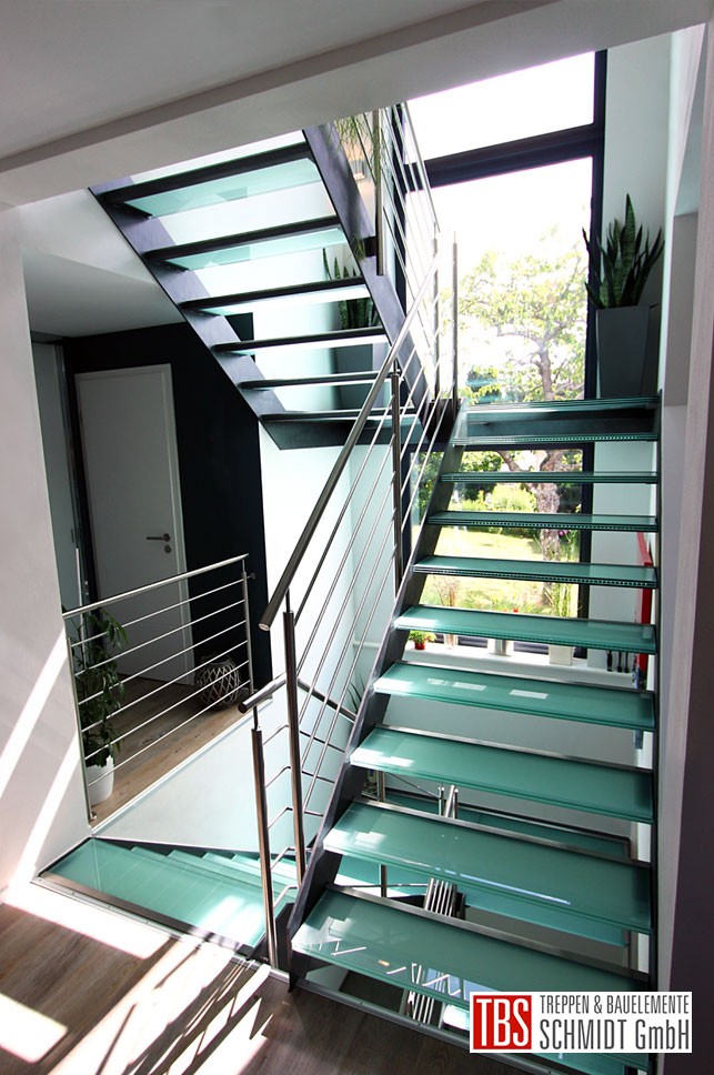 Die halbgewendelte Glastreppe führt über zwei Stockwerke durch das Treppenhaus und wird durch ein Glaspodest unterbrochen. In den Stufen sind LED Lichter integriert. Das Edelstahlgeländer sitzt klassisch jeweils zur Innenseite der Treppe.