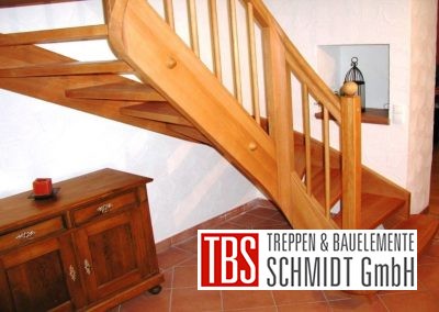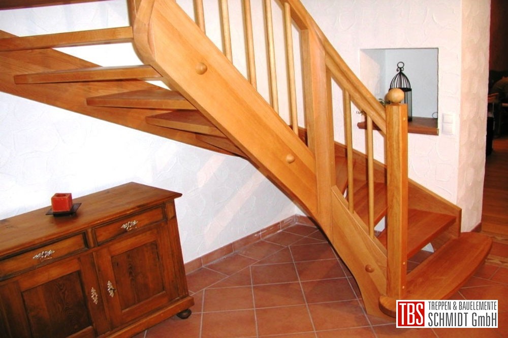 Die Wangentreppe verläuft halbgewendelt in das Obergeschoss. Das Geländer und die Treppenstufen bestehen aus dem gleichen Holz.