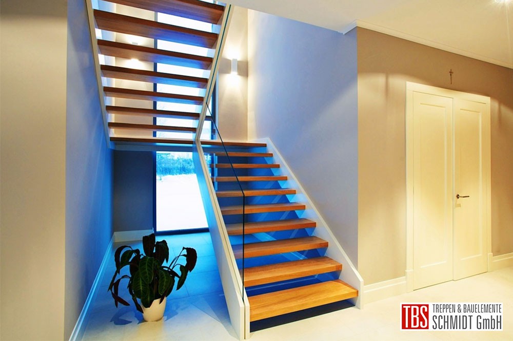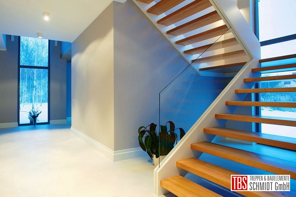 Die Color-Wangentreppe aus Eiche mit weißen Wangen und integriertem Glasgeländer/Glaswand führt über ein Podest in die obere Etage. Das VSG Glasgeländer wird an der Galerie weitergeführt und gibt den Blick ins Treppenhaus frei.