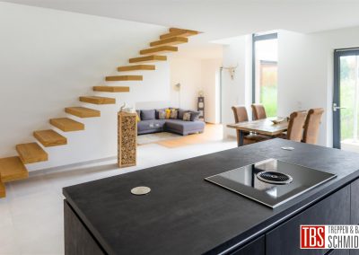 Über 16 Steigungen gelangt man mit Treppe des Monat September in die erste Etage des Wohnhauses in Moschheim. Die Stufen sind aus Eiche geölt und die Kragarmtreppe steht als Hingucker im offenen Wohn- und Essbereich.